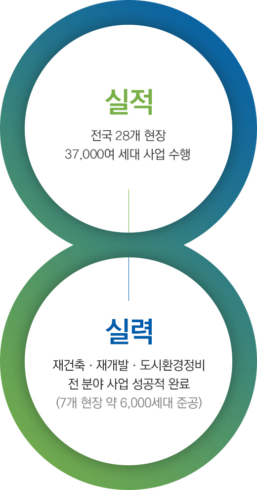 풍부한 경험, 즉 실적을 갖춘 회사가 있습니다. 최고 난이도의 사업을 성공한 실력을 갖춘 회사도 있습니다. 하지만 실적과 실력, 이 모두를 겸비한 회사라면 가장 최상의 파트너일 것입니다. 풍부한 실적은 물론 정비사업 전 분야에서 성공 노하우를 갖춘 실력있는 회사라면 믿고 맡기실 수 있습니다.