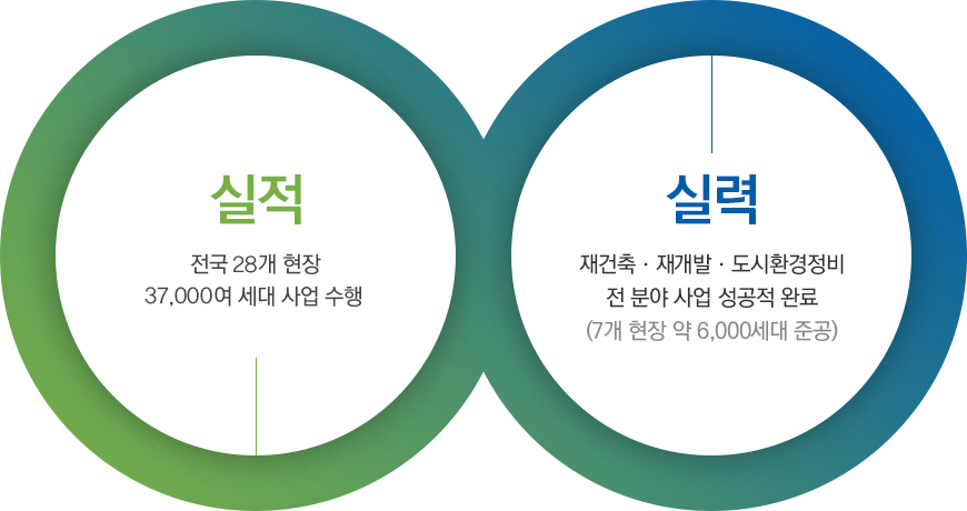 풍부한 경험, 즉 실적을 갖춘 회사가 있습니다. 최고 난이도의 사업을 성공한 실력을 갖춘 회사도 있습니다. 하지만 실적과 실력, 이 모두를 겸비한 회사라면 가장 최상의 파트너일 것입니다. 풍부한 실적은 물론 정비사업 전 분야에서 성공 노하우를 갖춘 실력있는 회사라면 믿고 맡기실 수 있습니다.
